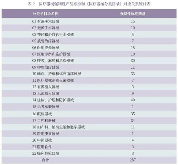 287 項(xiàng)強(qiáng)制性產(chǎn)品標(biāo)準(zhǔn)適用產(chǎn)品涉及《醫(yī)療器械分類目錄》中的21 個(gè)子目錄, 見(jiàn)表2。其中,97 項(xiàng)強(qiáng)制性產(chǎn)品標(biāo)準(zhǔn)適用于《醫(yī)療器械分類目錄》品名舉例中的特定產(chǎn)品,190 項(xiàng)強(qiáng)制性產(chǎn)品標(biāo)準(zhǔn)適用于《醫(yī)療器械分類目錄》中78 個(gè)二級(jí)產(chǎn)品類別項(xiàng)下的相關(guān)產(chǎn)品。18 個(gè)二級(jí)類別既有適用的基礎(chǔ)標(biāo)準(zhǔn)也有對(duì)應(yīng)的產(chǎn)品標(biāo)準(zhǔn),如子目錄10“輸血、透析和體外循環(huán)器械”中的腹膜透析設(shè)備有適用的基礎(chǔ)安全標(biāo)準(zhǔn)GB9706.39-2008《醫(yī)用電氣設(shè)備 第2-39 部分:腹膜透析設(shè)備的安全專用要求》,也有產(chǎn)品標(biāo)準(zhǔn)YY1274-2016《壓力控制型腹膜透析設(shè)備》和YY 1493-2016《重力控制型腹膜透析設(shè)備》。38 個(gè)二級(jí)類別有2 個(gè)以上適用的強(qiáng)制性產(chǎn)品標(biāo)準(zhǔn),如子目錄 01“ 有源手術(shù)器械”中的有源手術(shù)設(shè)備二級(jí)類別項(xiàng)下,適用的強(qiáng)制性標(biāo)準(zhǔn)就有3 項(xiàng), 包括YY 0844-2011《激光治療設(shè)備 脈沖二氧化碳激光治療機(jī)》、YY 0845-2011《激光治療設(shè)備 半導(dǎo)體激光光動(dòng)力治療機(jī)》、YY 0846-2011《激光治療設(shè)備 摻鈥釔鋁石榴石激光治療機(jī)》。