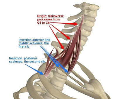 當頸椎固定時,斜角肌收縮可以上提肋骨,以協(xié)助完成呼吸的吸氣動作;當肋骨固定時,單側斜角肌收縮可使頸椎發(fā)生同側側屈,雙側收縮,可協(xié)助頸椎屈曲;另外斜角肌還能提供頸椎中下段的穩(wěn)定性。