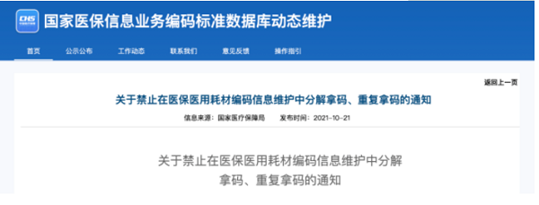 近日,國家醫(yī)保局發(fā)布《關于禁止在醫(yī)保醫(yī)用耗材編碼信息維護中分解拿碼、重復拿碼的通知》(以下簡稱《通知》)。內容指出:醫(yī)用耗材維護企業(yè)需于2021年10月31日前,對已維護賦碼的耗材產品信息進行梳理,對存在分解拿碼、重復拿碼情況的數據進行合并修正、重新提交。逾期未完成修正的,將停用有關產品編碼。